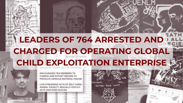 Le autorità lanciano l’allarme, coinvolgono le piattaforme e sensibilizzano i genitori: 764 prende di mira un pubblico giovanissimo o afflitto da problemi psichici. Nel 2025, alcune delle figure di spicco, come Trippy e War, vengono arrestate negli USA e in Grecia: l’FBI apre 250 fascicoli di indagine a carico dell’organizzazione, attivando tutti gli uffici territoriali dei singoli Stati.
